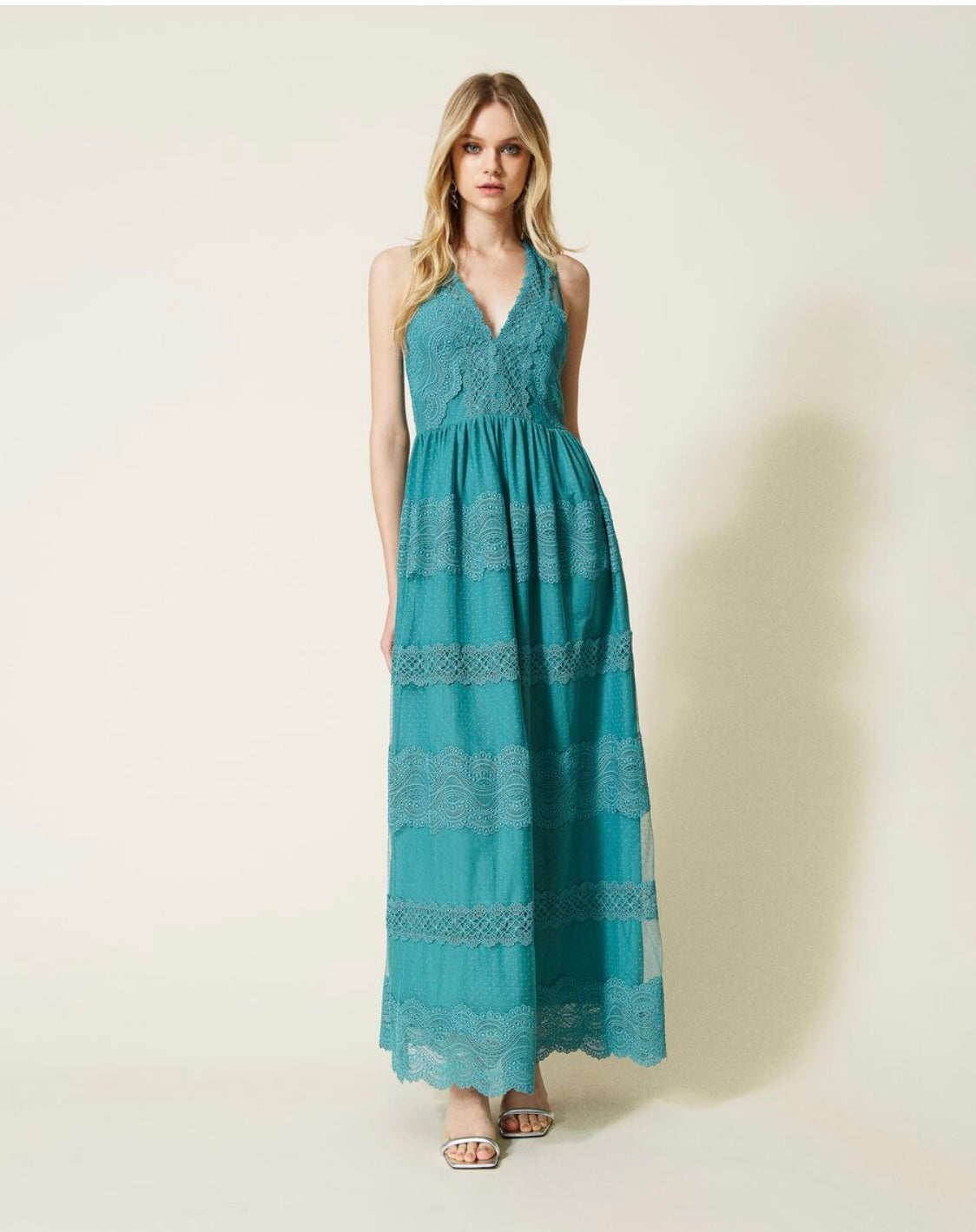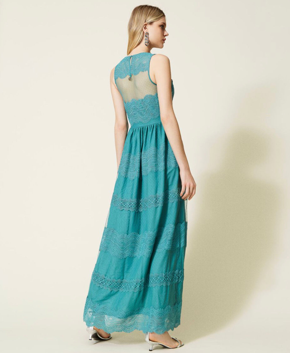 Long dress made from point d'esprit tulle with macramé lace borders, V neck, fitted bodice, wide gathered skirt, lining.