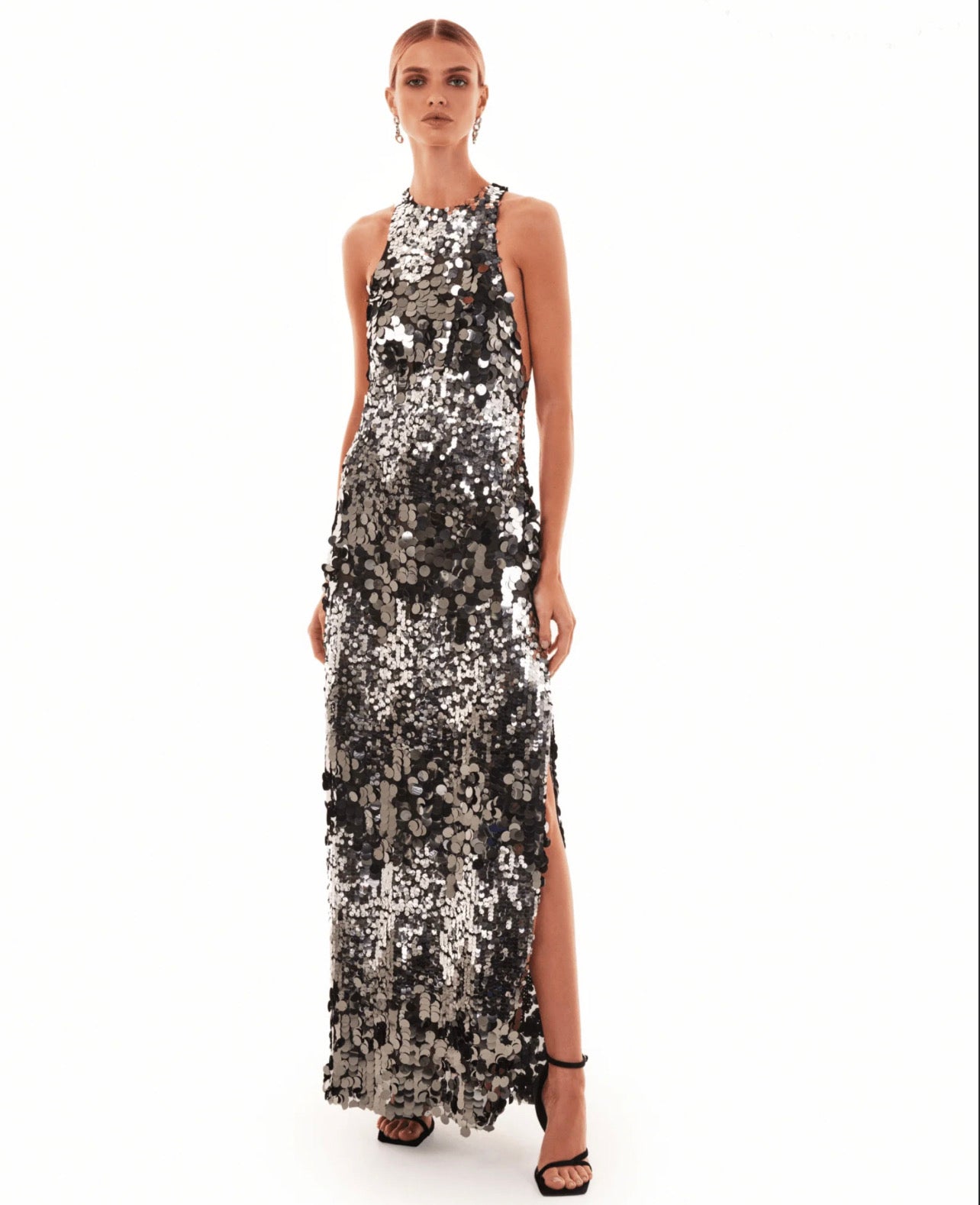 Turtleneck maxi dress decorated with dazzling sequins. Cut from a stretch jersey, it has a turtleneck design and a maxi skirt with a tight high slit.
