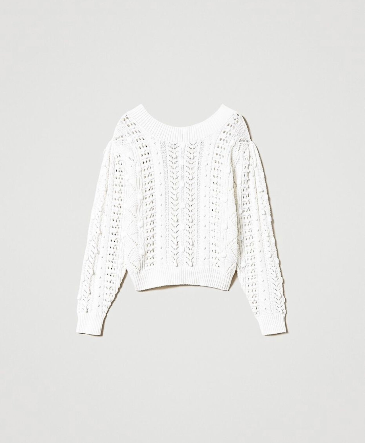 Cotton jumper with mixed stitches and mesh, handmade embroidery with faceted stones and wide round neck.
