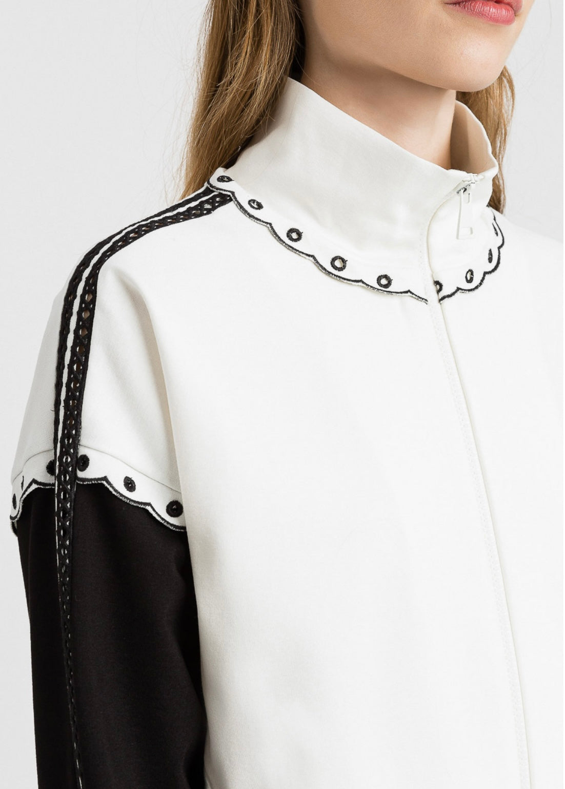 For tailoring a new tracksuit, the craftsmen chose a practical black and white color scheme. However, the set will not look boring and corny thanks to the scalloped frame on the sweatshirt with a stand-up collar and embroidered stripes that adorn the trousers with an elastic waistband. Products will be pleasant to the body, since the basis of the fabric is delicate viscose, and wear-resistant due to the small addition of elastic synthetic fibers.