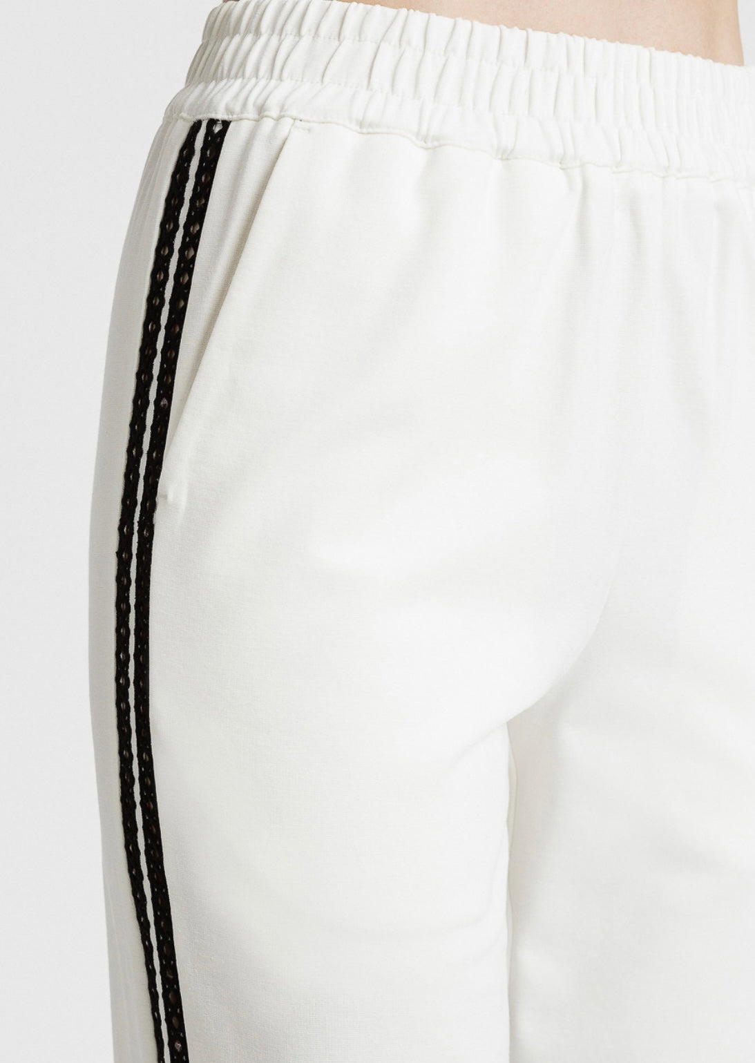White trousers from the Italian brand Twin Set. Straight cut, with elasticated waistband and two side pockets. Trousers are made of cotton jersey, decorated with black stripes, made using sewing technique.